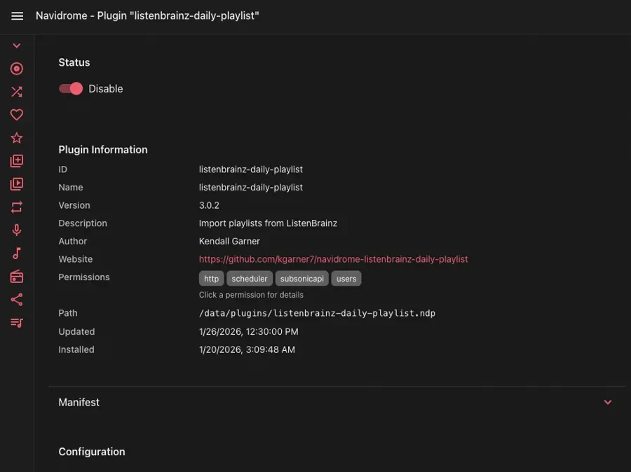 4. Enable the plugin: Go to the Navidrome web UI, navigate to the Plugins section in the admin area, and enable the plugin.