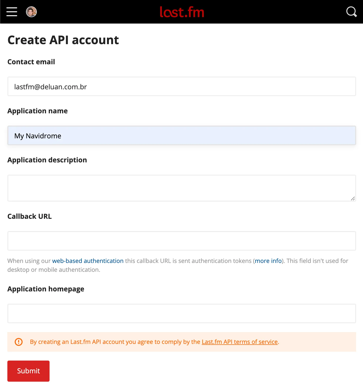 1. Go to https://www.last.fm/api/account/create and create an API account. Only the Application Name field is mandatory: